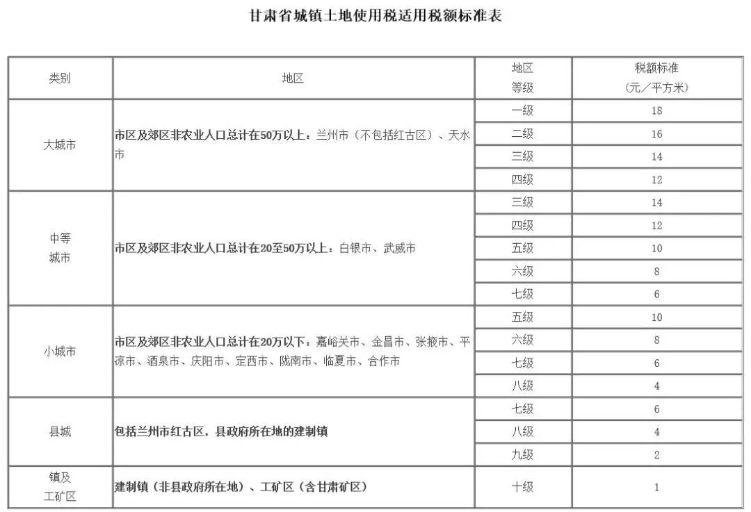 据悉,根据目前甘肃执行的城镇税率,每平米最低1元,最高18元。
