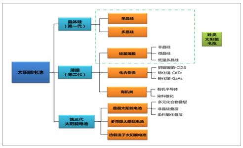 系统的应用。根据所用材料的不同,太阳能电池可分为三大类:第一类为晶体硅太阳能电池,包括单晶硅和多晶硅;第二类为薄膜太阳能电池,包括硅基薄膜、化合物类以及有机类;第三类为新型太阳能电池,包括叠层太阳能电池、多带隙太阳能电池以及热载流子太阳能电池等。由于化合物类、有机类薄膜太阳能电池存在原材料稀缺或者有毒以及转换效率低、稳定性差等,而第三代太阳能电池技术上尚未成熟,因此目前应用较多的太阳能电池主要包括单晶硅、多晶硅以及非晶硅薄膜太阳能电池。