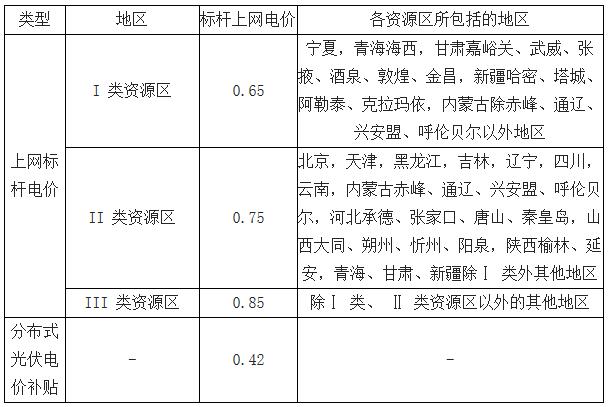 发展改革委员会于 2016 年 12 月发布《关于调整光伏发电陆上风电标杆上网电价的通知》(发改价格〔2016〕 2729 号),明确分资源区降低光伏电站标杆上网电价,三类资源区标杆电价下调 0.13-0.15 元/KWh 不等,而分布式光伏发电补贴标准则不作调整,维持 0.42 元/KWh 的标准,具体情况如下: