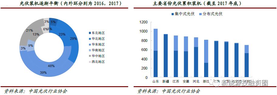 随着分布式光伏装机的爆发式增长,中国不同地区的光伏装机量逐步平衡。截止2017 年底,山东超越新疆成为中国光伏装机量最大的省份,其中山东的分布式光伏装机占到全省总装机规模的44.8%。