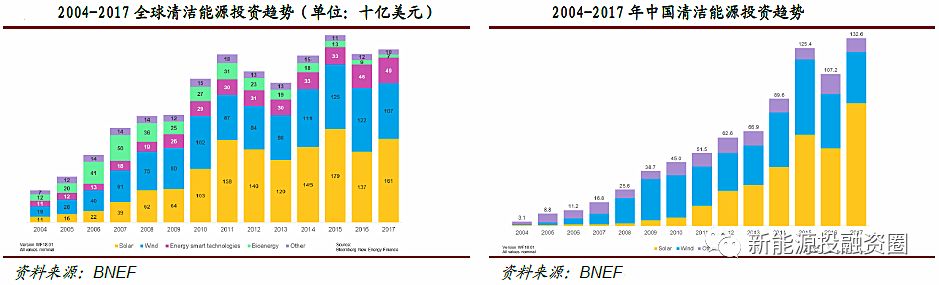 全球清洁能源投资持续增长,2004-2017 年的年均复合增速约为13.8%。近年来国际清洁能源投资稳定增长,全球清洁能源投资从2004 年的620 亿美元增长到2017 年的3330 亿美元,其中太阳能发电(主要是光伏发电)所占比例最大。中国近年来清洁能源投资高速增长,2004-2017 年的年均复合增速约为33.5%。中国清洁能源投资从2004 年的31 亿美元增长到2017 年的1326 亿美元,光伏发电投资占比最高。