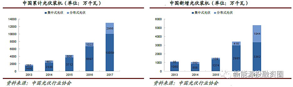 2017 年中国的光伏发电装机实现快速增长,分布式光伏实现爆发式增长。2017年,全国光伏装机5306 万千瓦,同比增长54%,占全部新增电力装机的40%。其中,集中式光伏装机增速减缓,同比增长11%,分布式光伏爆发式增长,新增装机达到1944 万千瓦,同比增长3.7 倍。