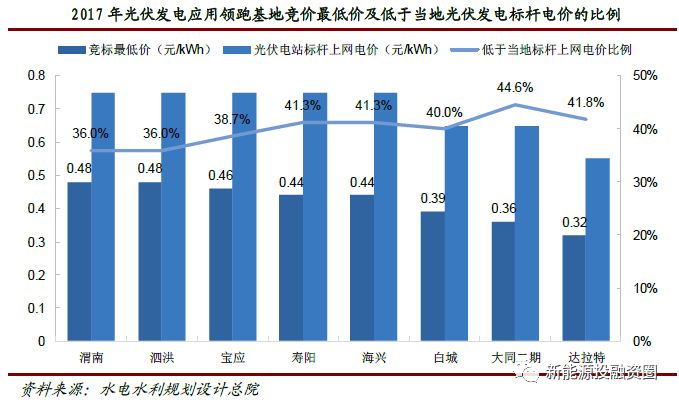 光伏产品价格的下降使得光伏电站装机成本不断下降。在水电水利规划设计总院公布的2017 年光伏发电应用领跑基地申报电价中,最低申报电价普遍低于应用领跑基地当地光伏上网标杆电价40%左右。