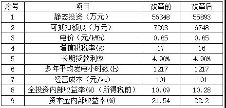 光伏发电项目价格政策中确定的上网标杆电价为含税电价,上网标杆电价确定后,发电收入缴纳增值税率由17%调整为16%,售电纳税额减少,相应不含税营业收入增加。以上述项目举例,调整前后资本金内部收益率增加了0.66%。
