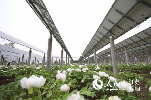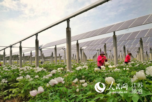 光伏板整齐排列,白牡丹摇曳生姿,几位农民正忙着给牡丹除草松土。“这是我们种植的油用牡丹,也是我们探索的农光互补新模式。”协鑫新能源副总裁张耀邦指着绵延数里的牡丹花海说。