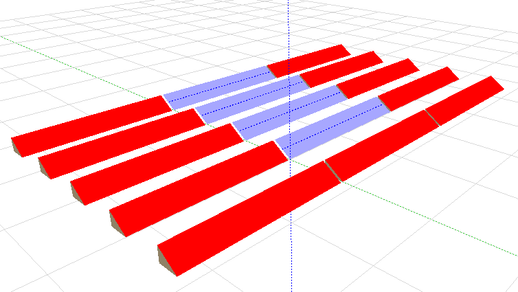图中蓝色的为本次所要研究对比的光伏组件安装区域,共4个支架8个组串;红色区域表示其周边的其他光伏阵列,这些阵列只作为遮挡物,而不接收辐射,主要用于模拟周边阵列对目标阵列的遮挡。