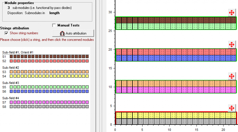 同样,我们在PVsyst中进行Module layout的设置,除了设置C型和一型外,同时也将状态相同的组串分配到同一路MPPT下。具体的设置见图: