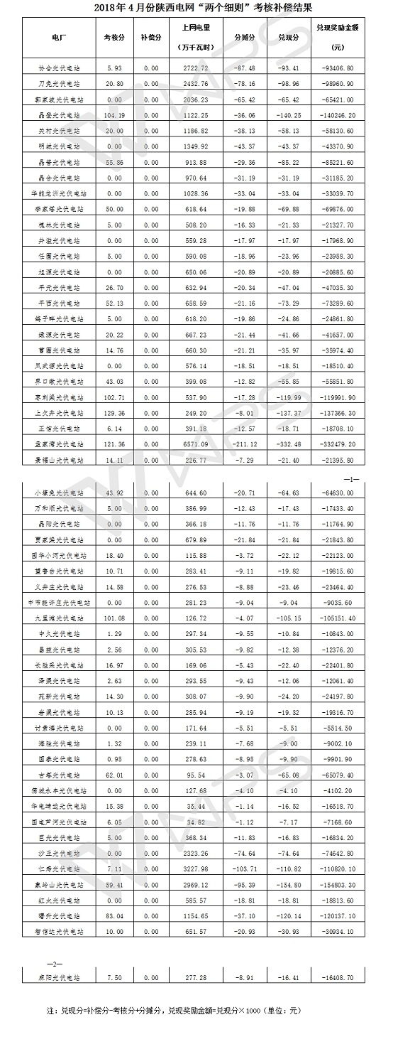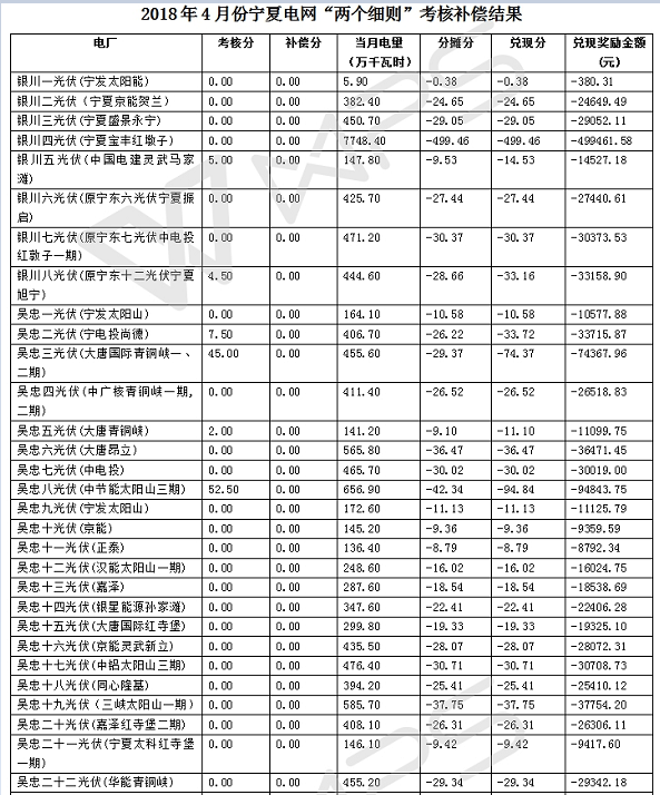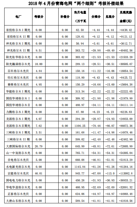 根据《关于印发<西北区域发电厂并网运行管理实施细则>及<西北区域并网发电厂辅助服务管理实施细则>的通知》(西北监能市场〔2015〕28号)规定,2018年4月份陕西、宁夏、青海电网发电厂并网考核和辅助服务补偿结果复核工作已完成,现予公布,请据此结算。
