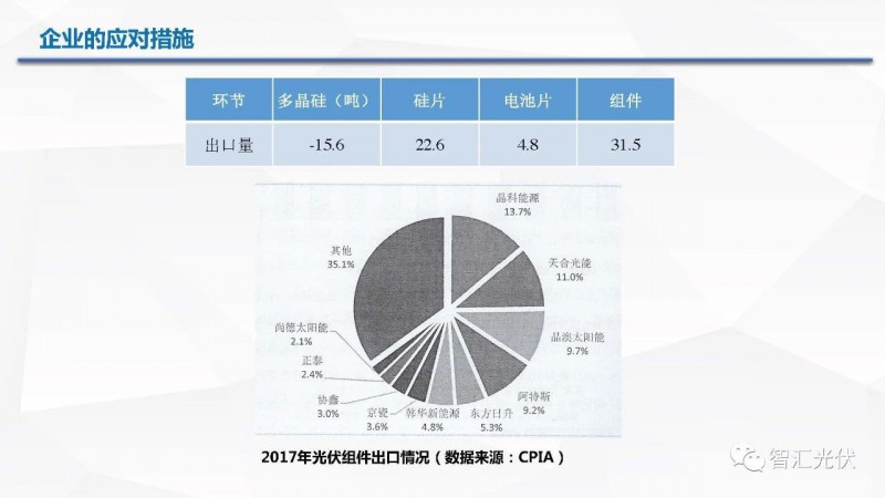 2017年,中国组件出口量达到31.5GW,而2017年全球除中国以外的海外新增装机仅有50GW。因此,中国的组件在海外的占有率达到60%以上!