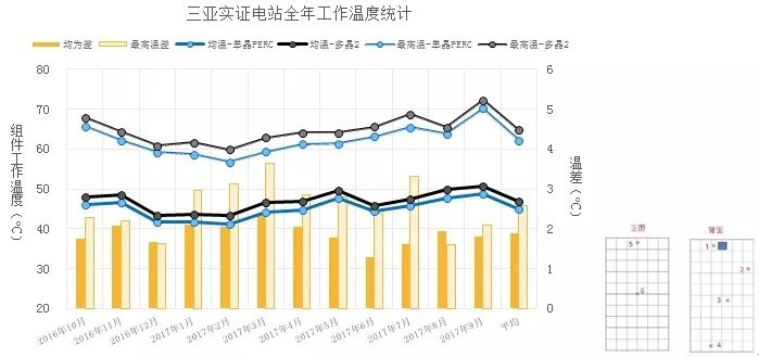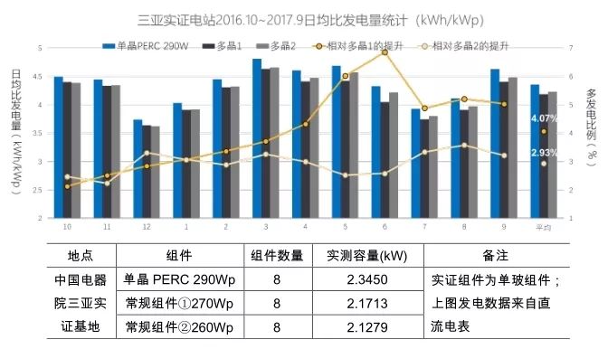 中国电器院的三亚海洋性气候实证基地的实证结果自之前的两篇报道后,也于2017年9月底完成了 1年的实证,全年的发电统计如下,隆基乐叶低衰单晶PERC组件相对常规组件①增益4.07%,相对常规组件②增益2.93%,两种常规组件来自不同的一线制造商。所有组件在投样前均在第三方机构测试了初始功率并采用该功率值计算比发电量,保障了公平性。