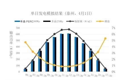 笔者使用PVsyst模拟了单晶PERC组件与常规组件的晴朗天气下的日发电情况 (4月1日),增益曲线与第1部分的泰州实证数据相似,全天的发电增益为1.5%,同样低于实证结果。
