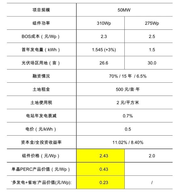 如下表条件下,设定BOS成本分别为2.3元/W(单晶PERC 310W)和2.5元/W(常规275W),考虑低衰单晶PERC组件相对常规组件多发电3%。计算得全投资收益8.4%时,单晶PERC组件可多卖0.43元/W,扣除BOS成本差后,得到的0.23元/W就是单晶PERC组件多发电与用地节省带来的产品价值。