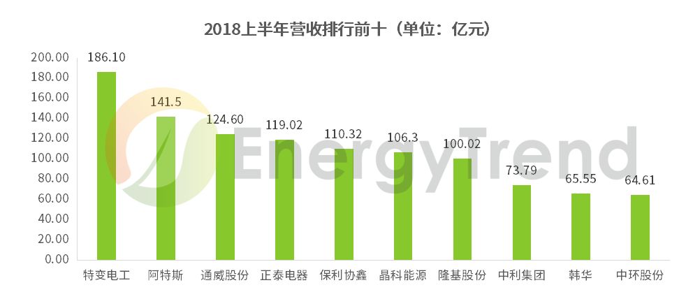总体来看,有将近七成的企业营业额实现增长,特变电工、阿特斯、通威、正泰、保利协鑫、晶科、隆基营收均破百亿,分别达到186.1亿元、141.5亿元、124.6亿元、119.02亿元、110.32、106.3亿元、100.02亿元。除此之外,中环、隆基、阿特斯等企业营收增幅超50%。