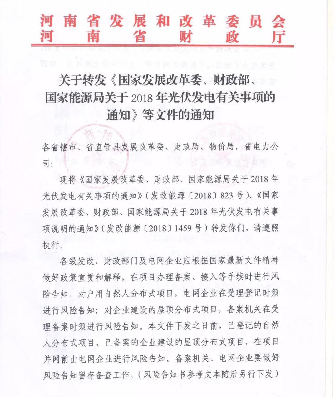 近日记者了解到,河南发改委财政厅联合发布《关于转发《国家发展改革委财政部国家能源局关于2018年光伏发电有关事项的通知》等文件的通知》,文件中指出:河南光伏平价上网项目,待国家有关文件出台后,再研究推进。