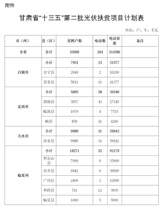一、经国家能源局、国务院扶贫办审定,本批下达22个县(区)村级光伏扶贫电站项目204个,总规模314586千瓦,帮扶对象为55090户建档立卡贫困户(详见附件)。2018年9月省发展改革委、省扶贫办以甘发改能源〔2018〕701号文向定西市渭源县、武威市古浪县和天祝县调整指标纳入本批项目计划实施。