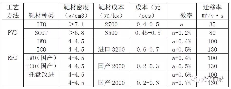 效率上RPD现阶段较PVD(ITO)优势在0.4%左右,可以通过托盘优化将差异拉开至0.6%以上,并且可以通过使用其他更高效的靶材进一步拉开与PVD的效率差异至0.7%。但是RPD缺点较为明显,第一:设备产能较低(百MW投资高)导致售价高 ,第二:RPD主要核心部件为住友把持,成本较高,第三:RPD的靶材受制于住友专利问题销售限制性较大,并且成本过于高昂。但现阶段常州捷佳创/台湾精曜已经开始开发6000pcs以上产能设备,预计2020年推出,在产能翻倍同时成本不会成倍增加。其次国内靶材公司已经开发出住友相关使用于HIT的高效靶材,靶材成本大幅下降。
