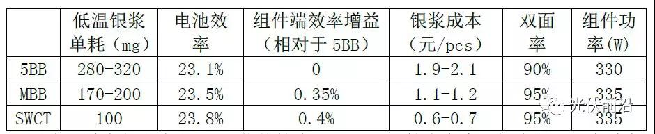 电池效率与成本上SWCT优势较为明显,MBB技术在克服拉力问题后在效率和成本上相对于优势5BB较为明显,现阶段MBB技术在国内已经量产验证可靠性较高,SWCT技术在国内未经过量产具体组件功率为设备厂家公布数据。(以上效率基于PVD直流磁控溅射非RPD)