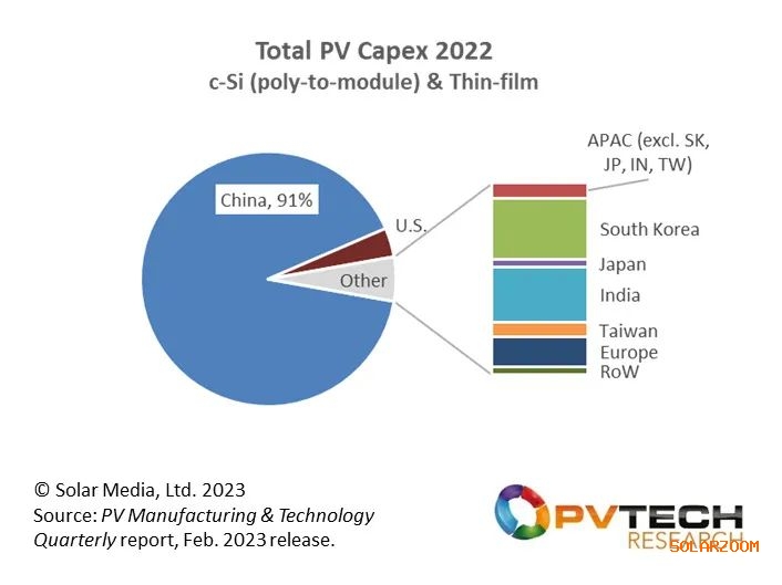 2022年的光伏总资本支出(涵盖了c-Si从多晶硅到组件以及薄膜的所有阶段)略高于270亿美元,创下行业历史新高。其中,中国企业占比超过90%。