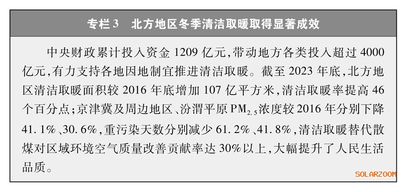 促进终端用能电气化低碳化。工业领域以生产加热、烘干、蒸汽供应等环节为重点,实施高温热泵、电加热等电能替代,推动化工、冶金领域可再生能源制氢示范应用。建筑领域广泛使用太阳能热水器、电炊事等,积极推进北方地区清洁取暖,推动以电力、天然气、生物质、地热、工业余热等清洁低碳能源替代燃煤供暖,2023年北方地区清洁取暖率近80%。交通运输领域大力推广新能源汽车,提升铁路电气化水平,推行船舶、飞机靠港使用岸电。截至2023年底,中国新能源汽车保有量超过2040万辆,全国铁路电气化比例达73.8%。全社会终端用能电气化率达28%,十年来电气化水平提升约7个百分点。