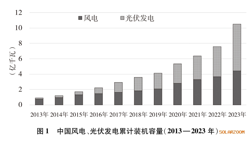 推动风电、光伏发电跃升发展。中国风能、太阳能资源丰富,风电、光伏发电成为清洁能源的主力军。有序推进大型风电光伏基地建设,以库布其、乌兰布和、腾格里、巴丹吉林沙漠为重点,规划建设4.5亿千瓦大型风电光伏基地项目。推进海上风电规模化集群化发展,累计装机规模达3728万千瓦。积极推进分布式新能源发展,开展“千乡万村驭风行动”“千家万户沐光行动”,推广农光互补、渔光互补、牧光互补等“光伏+农业”新模式,打开了农村新能源发展的广阔空间。截至2023年底,中国风电、光伏发电累计装机容量分别达4.41亿千瓦、6.09亿千瓦,合计较10年前增长了10倍。其中,分布式光伏发电累计装机容量超过2.5亿千瓦,占光伏发电总装机容量40%以上。