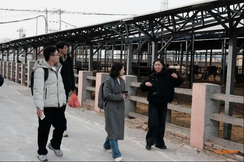 2月14日,支队成员们走进山东省禹城市房寺镇邢店社区,围绕“牧光互补”新型农业模式与分布式光伏项目展开实地调研。作为禹城市畜牧环保与清洁能源结合的典范,该合作社通过“棚顶发电、棚下养牛”模式,实现了光伏发电与肉牛养殖的协同发展。合作社负责人介绍,通过在牛舍屋顶安装光伏板增加年均发电量,不仅降低养殖场用电成本,又将余电并入国家电网,促进了清洁能源的高效利用,实现了经济效益与生态效益的双赢。邢店社区的“牧光互补”光伏项目不仅是经济增收手段,更推动了农村能源结构从“高碳”向“低碳”转型,为全国农村提供了可复制的样本。
