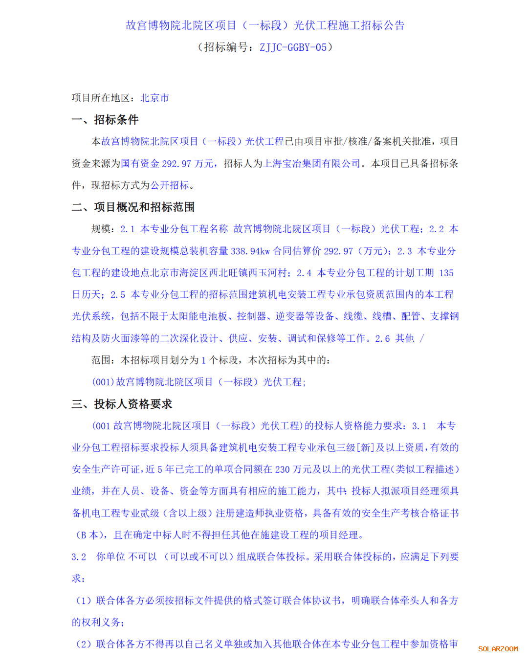 8月6日,故宫博物院北院区项目(一标段)光伏工程施工招标公告发布(公告原文见附件)。
