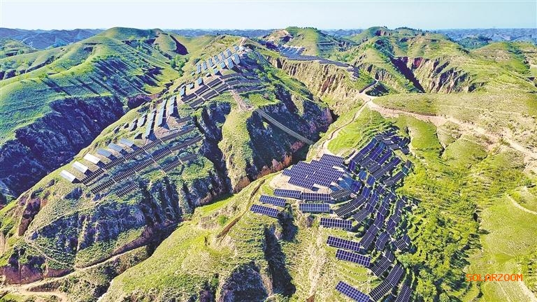 9月7日傍晚,在绥德县名州镇马连沟村的后山坡上,连片的光伏发电板在夕阳的照射下蔚为壮观。如今,这片坡地成了村集体和村民的“增收宝地”。