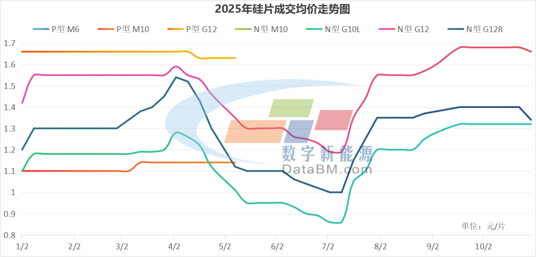 据数字新能源DataBM.com数据,N型硅片G10L、G12、G12R的成交均价分别为1.32元/片、1.68元/片、1.40元/片;对比今年7月初的0.86元/片、1.19元/片、1.00元/片,三类硅片价格分别上涨了53.49%,41.18%,40.00%。