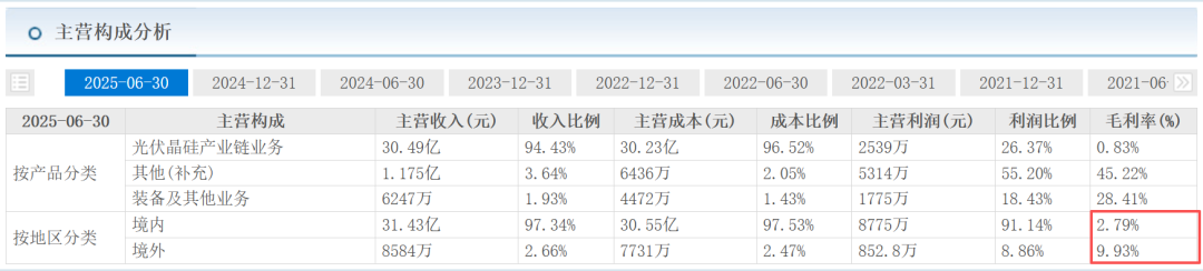 从其市场布局来看,弘元绿能当前营收仍以国内市场为主,截至2025年6月30日,海外市场收入占比仅2.66%。但不得不提的是,尽管海外业务占比低,但其光伏业务毛利率却约是国内业务的4倍。具体如下: