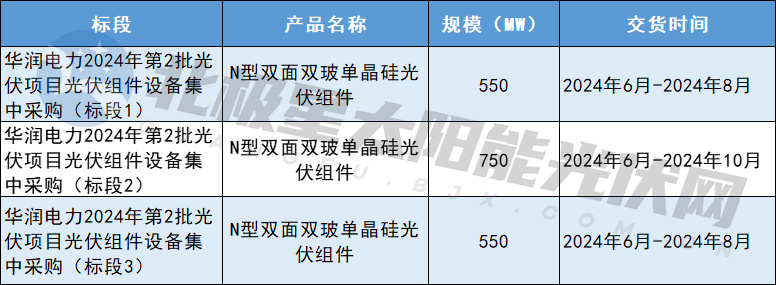 5月10日,华润电力2024年第2批光伏项目光伏组件设备集中采购招标,本项目采购N型组件1850MW,分为3个标段: